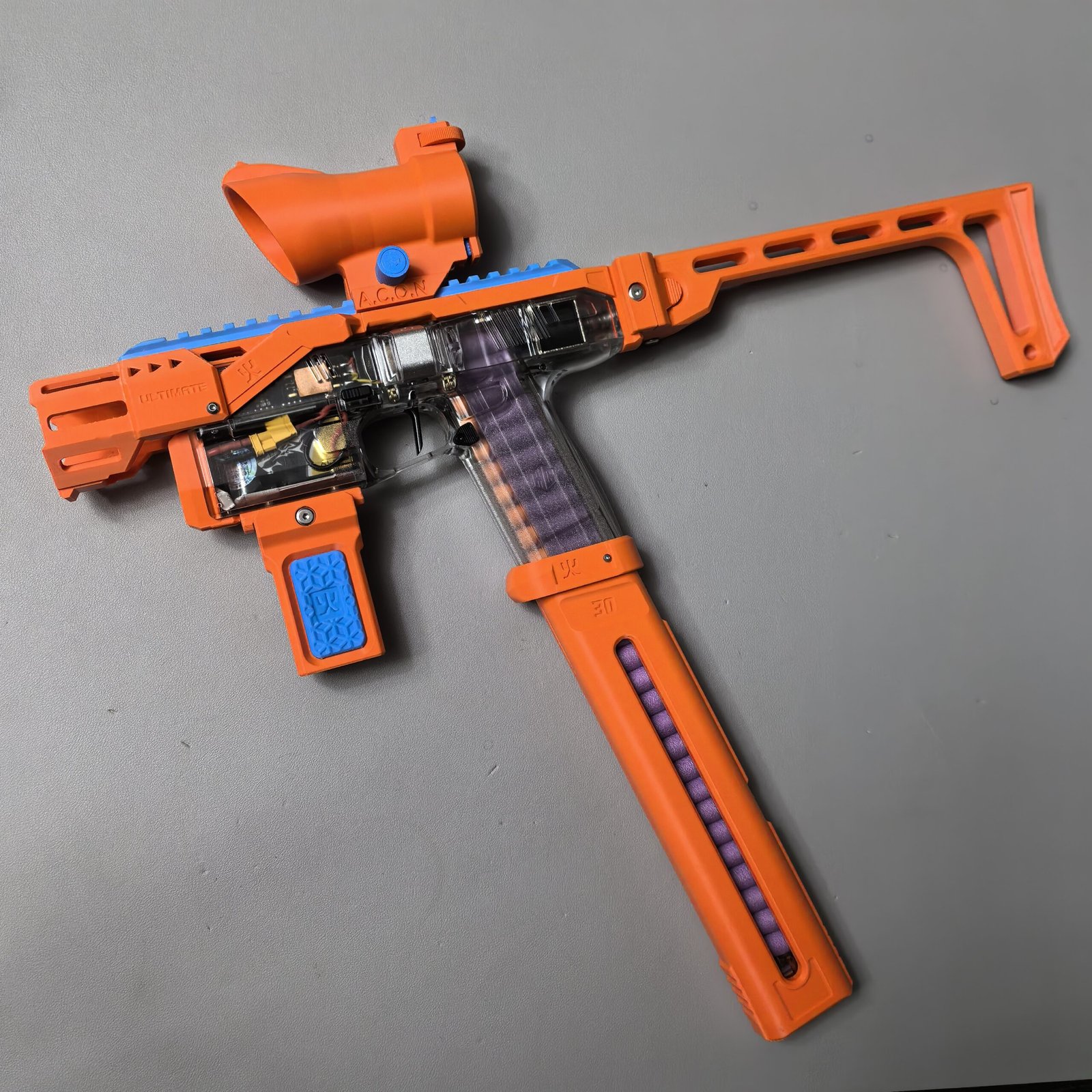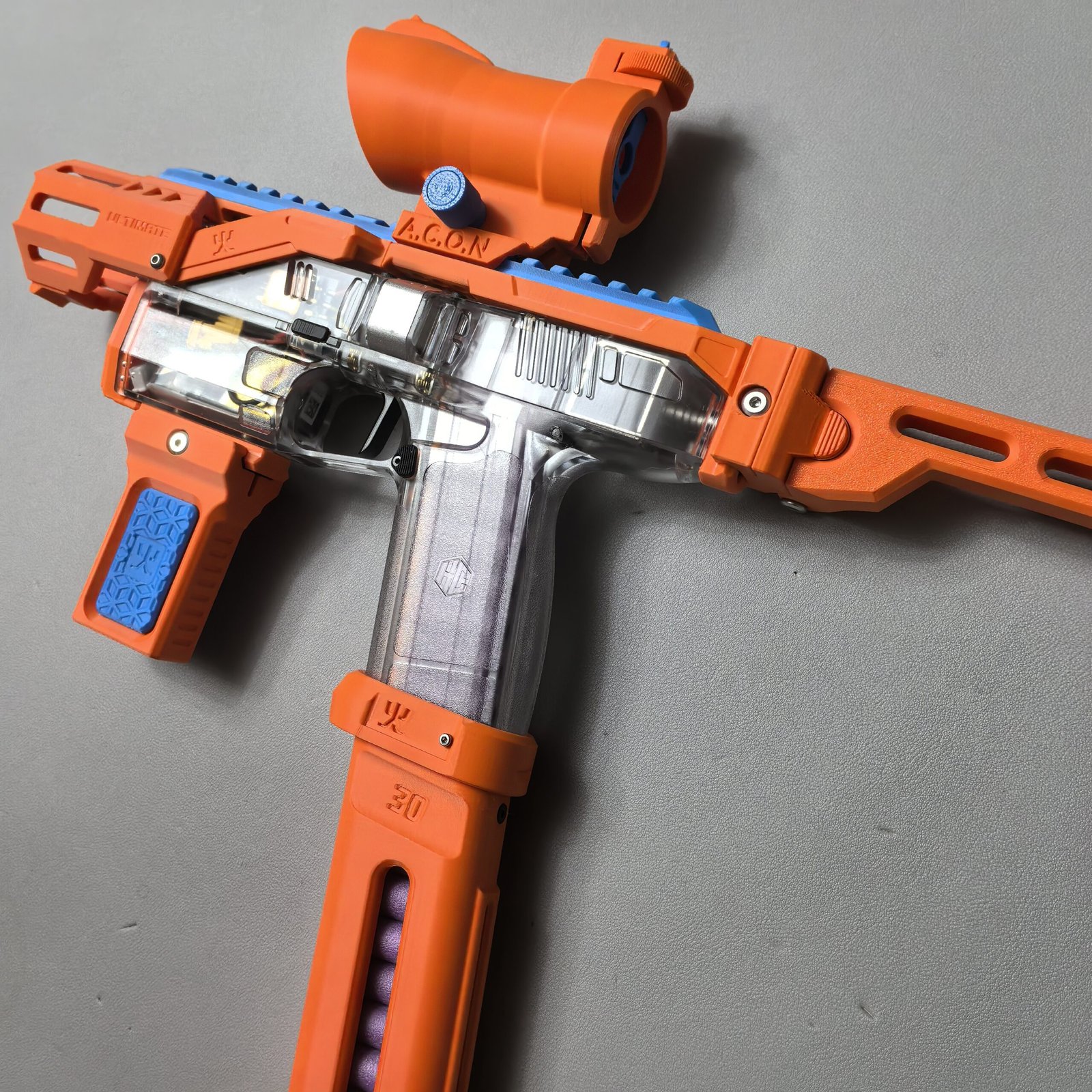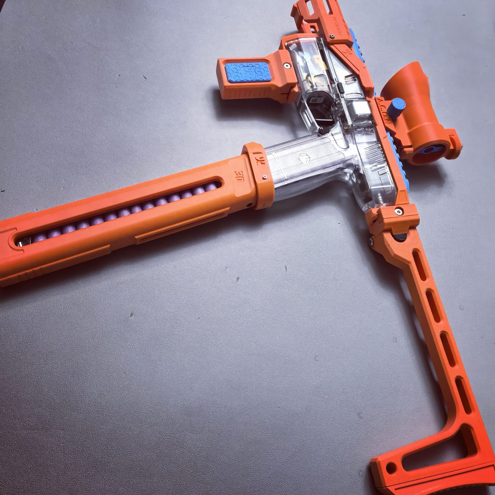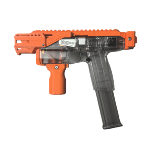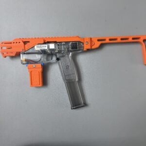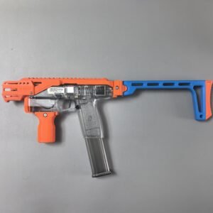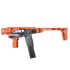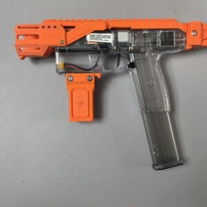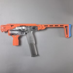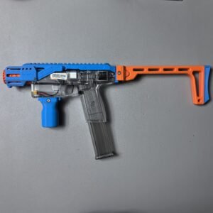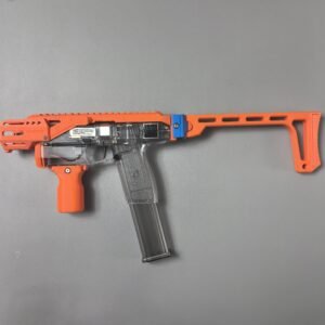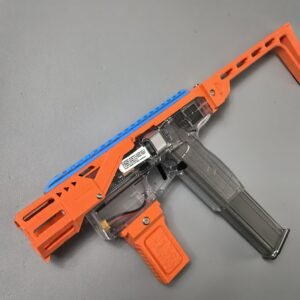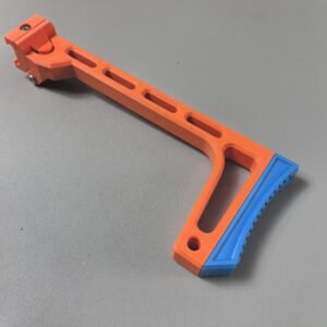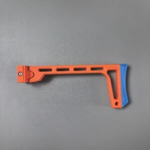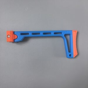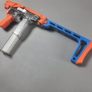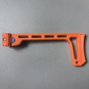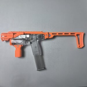 This relaunch optionally supports a foldable stock designed by Mr. Liu (from the Zhu Rong Extra kit for Big Jolt). The stock can be folded for compact storage but does not lock in the folded position, and its use is entirely optional for users who prefer their own stock solutions.