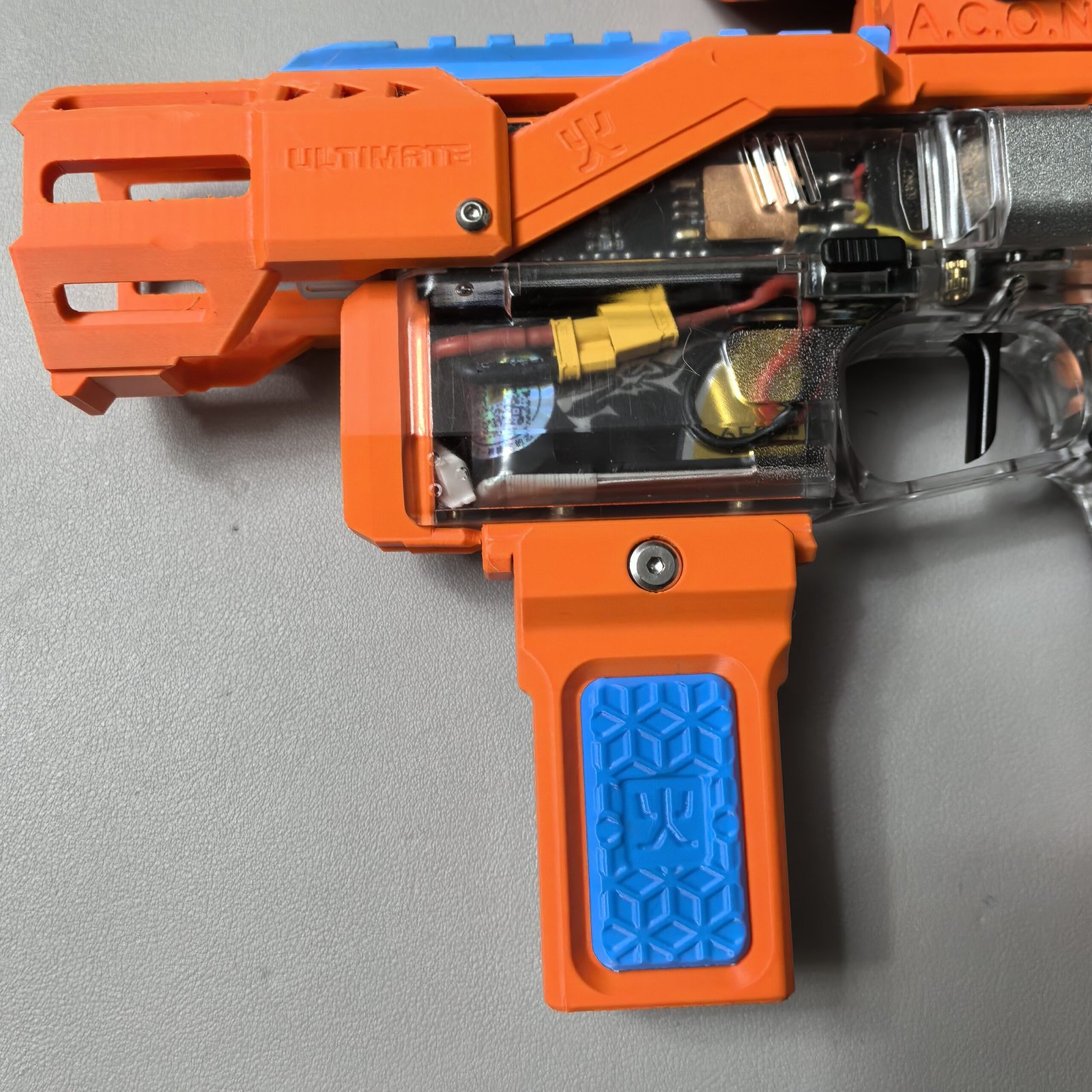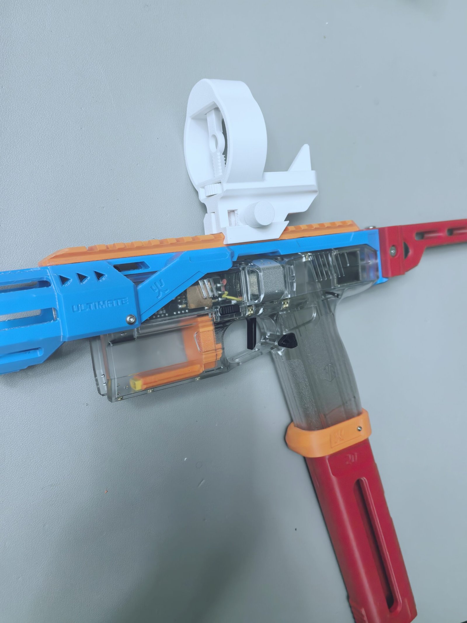The designer himself is an active field-game launcher player and has been using this design in real gameplay for over a year, indicating stable performance under normal field use. However, for arena players who favor highly aggressive movement styles—such as slide kneeling or wall-running—the overall structural strength of the mod remains uncertain, as it is secured by five screws with relatively shallow thread engagement.