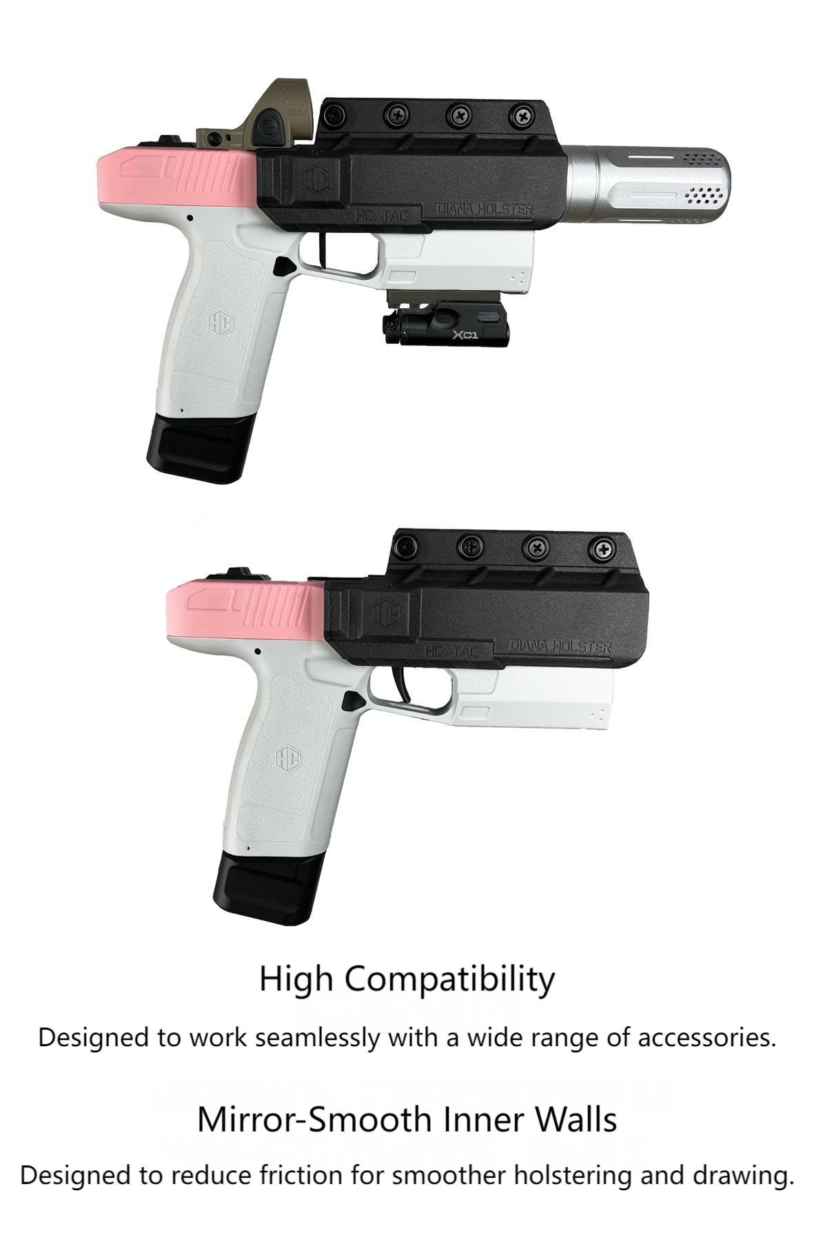 Diana’s holster is designed with extra clearance, allowing a perfect fit even when you install upgrades such as a red dot sight, front grip, or extended muzzle attachments.