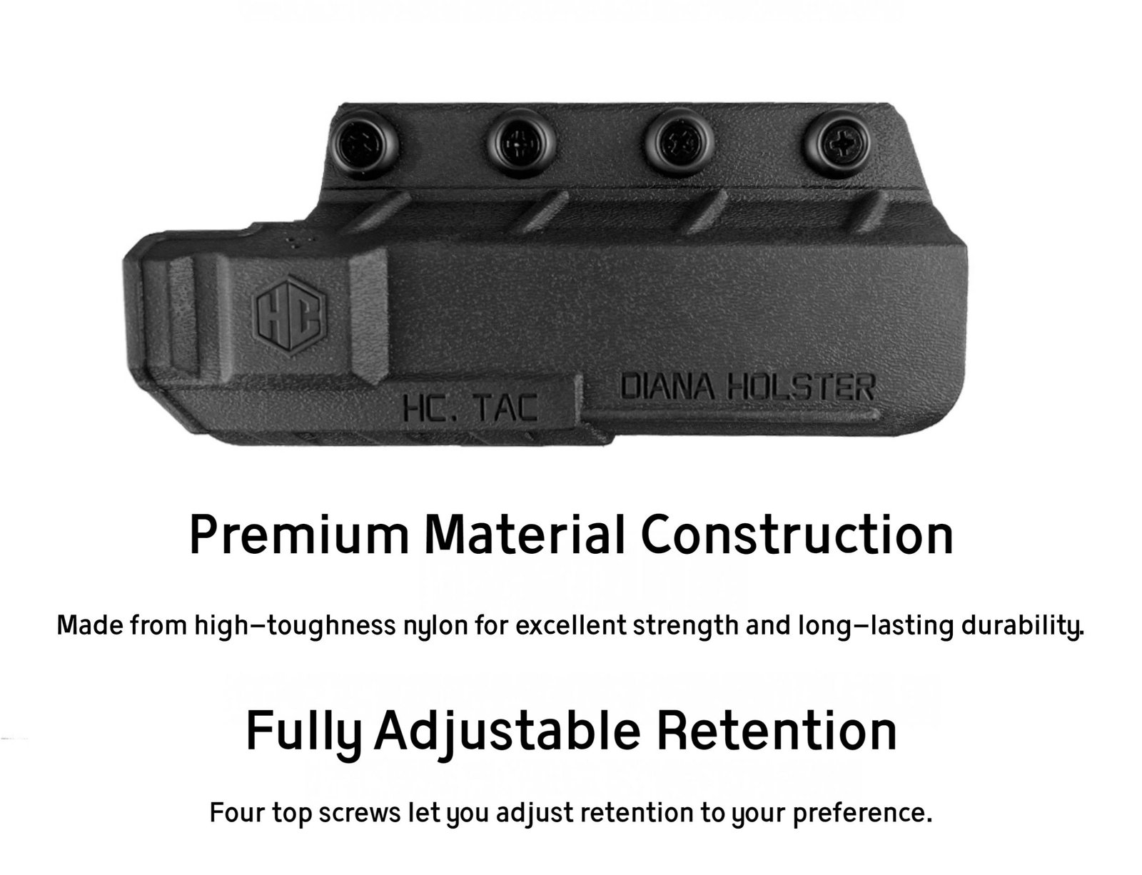 Note: If you’re using the HC Diana appearance kit sold on our site, the Diana will not fit this holster. The two accessories can’t be used at the same time, but the appearance kit is fully removable if you wish to switch setups.