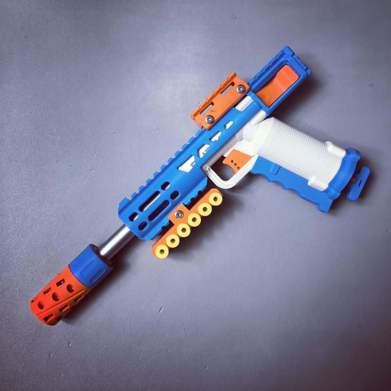 When using our printed Adjustable sights, the dart holder may only be mounted on the bottom rail, which conflict with the foregrip position.