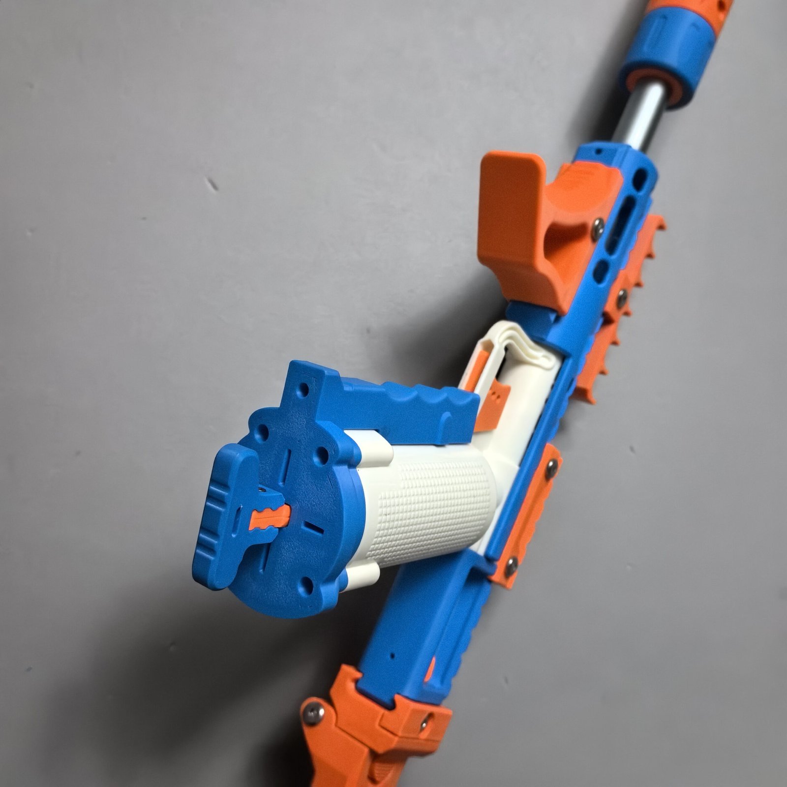 Zhu Rong Extra, designed by Mr. Liu, is based on the original Zhu Rong mod, with major changes to the feeding system and interaction style. By intentionally giving up part of the air seal, the design achieves a more interesting and efficient feeding method. This makes it especially suitable for indoor play and casual use, allowing the blaster to be loaded and fired easily at almost any time without strict operation timing.
